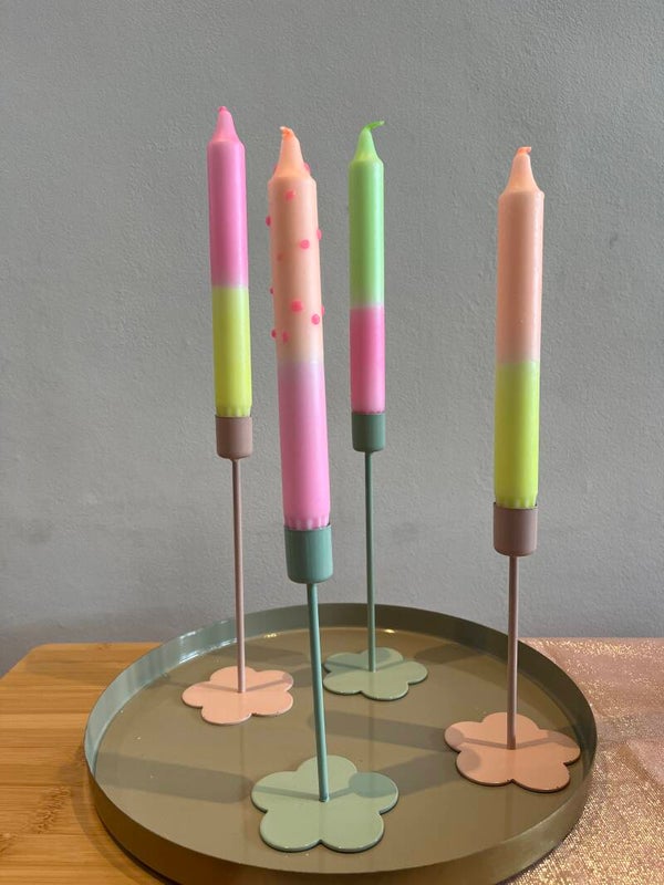 Deze kaarsen passen perfect bij de glazen pot met Kandelaar voor een vrolijke en zomerse sfeer. Hoewel de kaarsen niet in de pot passen, kun je de pot vullen met leuke decoratie en er een dip dye kaars in plaatsen voor een super vrolijke kandelaar!