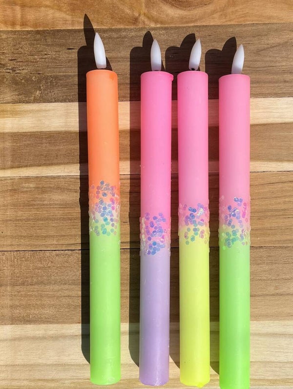 De kaarsen zijn in de vrolijke kleurencombinaties van Oranje, Groen en met glitter in het midden en beschikken over een timer functie. 6 uur aan en 18 uur uit.