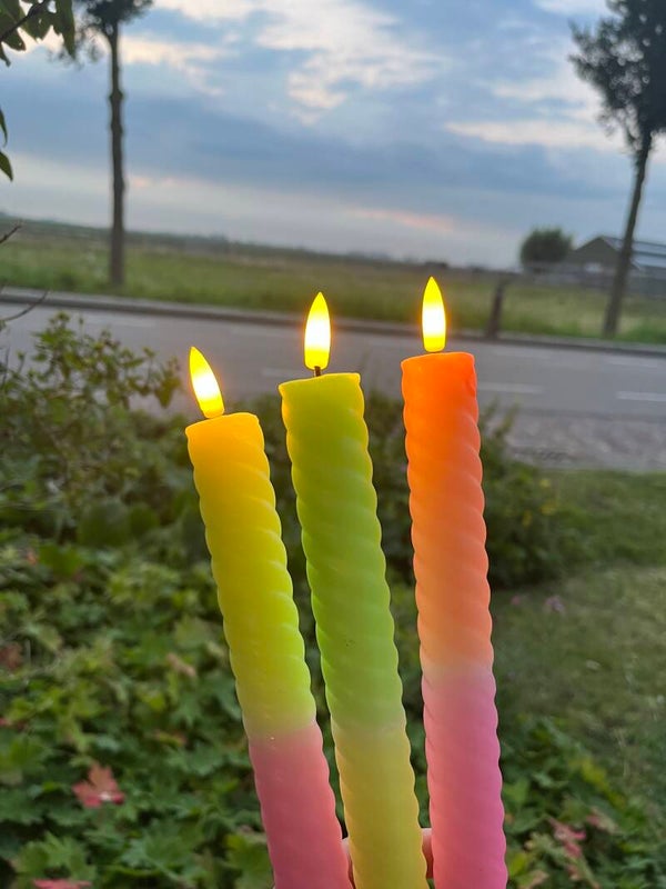 De kaarsen zijn in de vrolijke kleurencombinaties van Geel met Roze en beschikken over een timer functie. 6 uur aan en 18 uur uit.