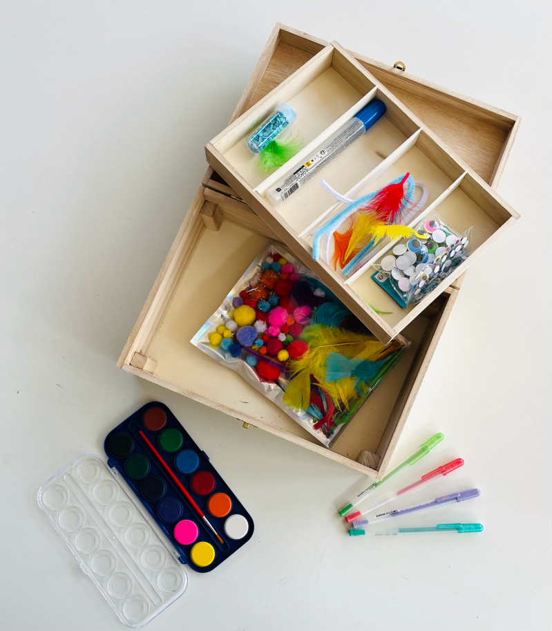 De knutselkist heeft een uitneembaar bakje, waarin je je potloden/stiften en kleine spulletjes in kan bewaren. Op de bodem is er ruimte voor de wat grotere knutselspullen.