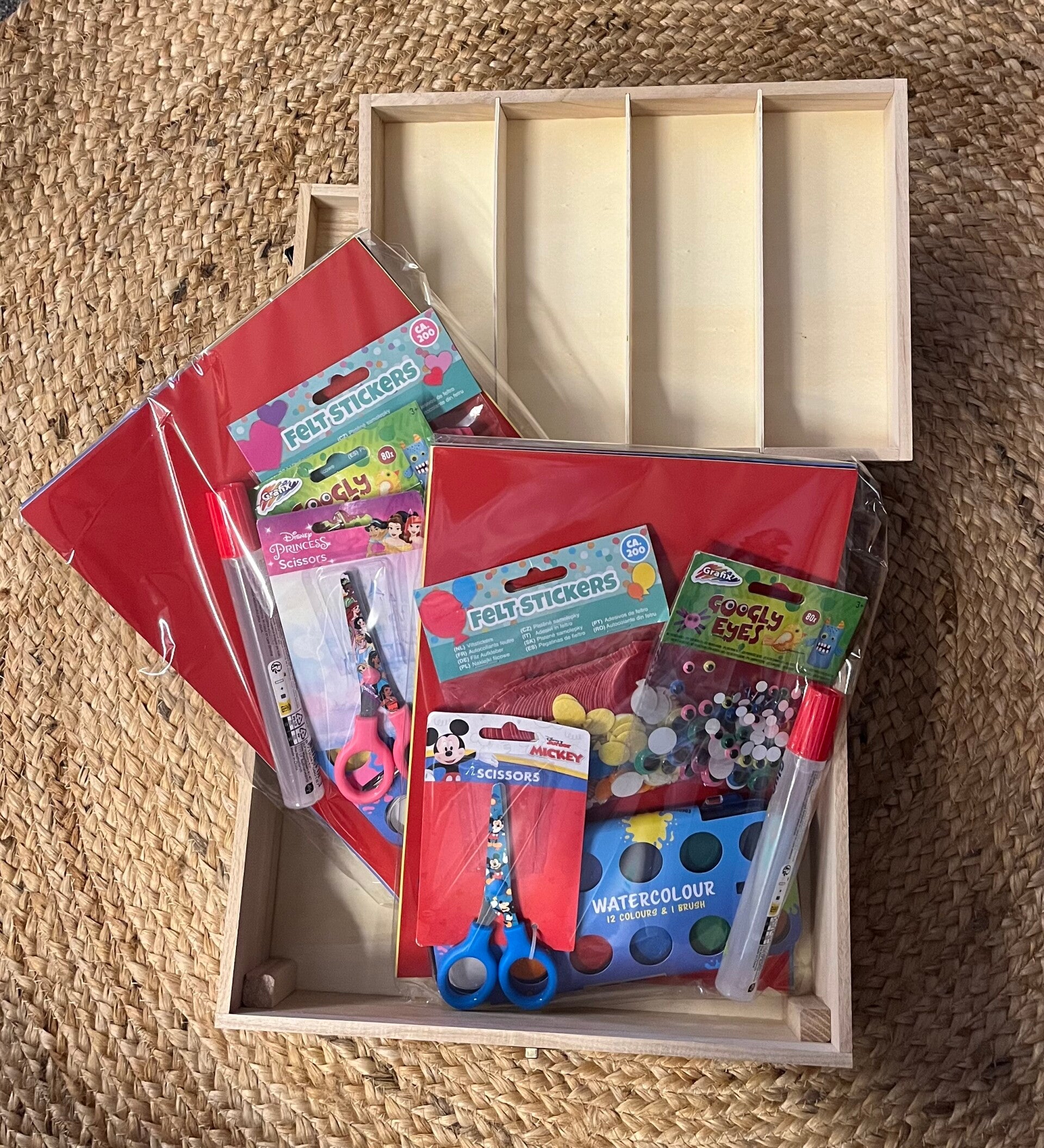 Er is een mogelijkheid om bij de kist een knutselpakketje bij te bestellen. Een compleet start pakketje met lijm, schaar, papier, waterverf en stickers. Zo is het nog leuker op een knutselkist te krijgen.