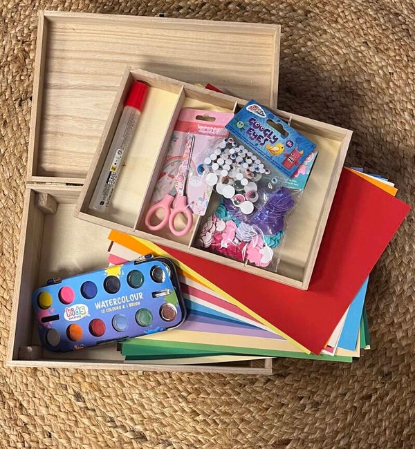 Er is een mogelijkheid om bij de kist een knutselpakketje bij te bestellen. Een compleet start pakketje met lijm, schaar, papier, waterverf en stickers. Zo is het nog leuker op een knutselkist te krijgen.