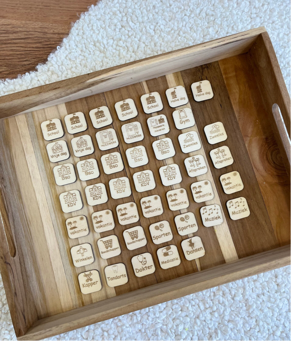 De weekplanner is van beukenhout en heeft de afmeting: H 29 cm en Br 35 cm. De pictogrammen zijn 2,5 bij 2,5 cm. Aan de bovenkant word de naam gegraveerd. Waardoor de planner nog persoonlijker word.