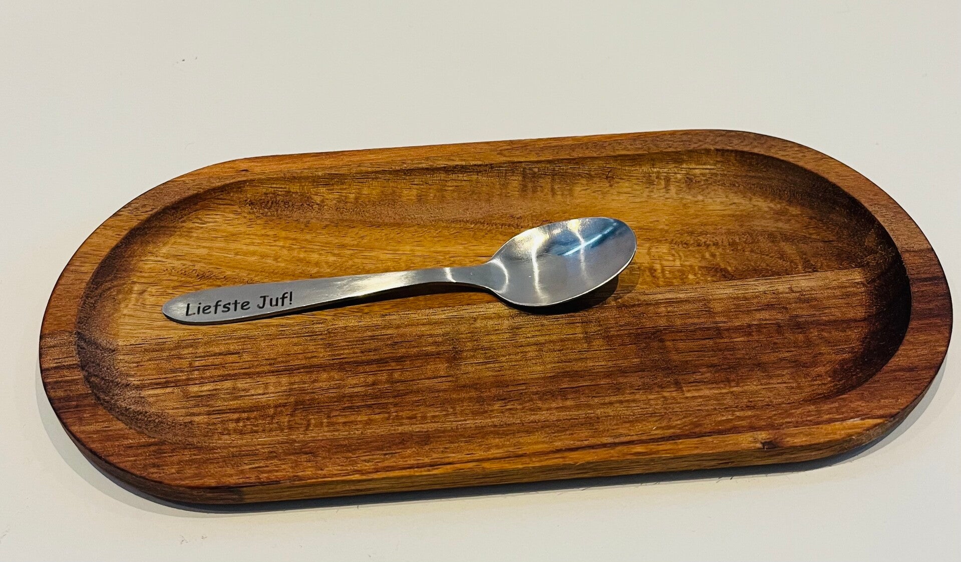 Het lepeltje is van RVS en kan in de vaatwassser. Leuk samen met een Thee glas Juf Thee glas Meester.