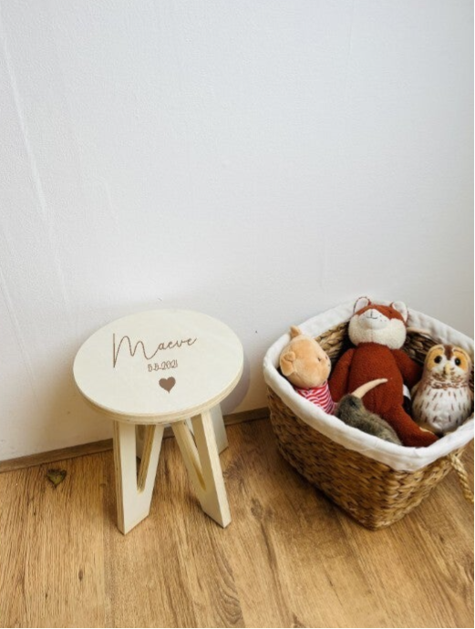 Een perfecte aanvulling voor de speelhoek of bij het bureautje of speeltafel. Een mooie en stevige houten kruk met naam en afbeelding van een hartje. Eventueel ook de mogelijkheid om geboortedatum bij te laten graveren.